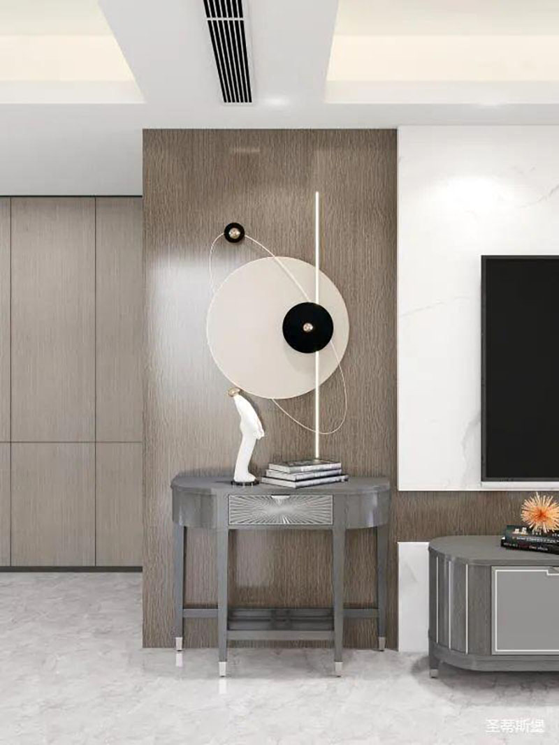 ▲設(shè)計師巧妙的運用填充藝術(shù),將客廳電視與沙發(fā)背景色彩相呼應(yīng),利用凹凸互補的設(shè)計手法,傳遞著空間時尚。莫蘭迪實木家具,配以同色系的高級金屬底座,將精致輕奢從細(xì)節(jié)中脫穎而出。