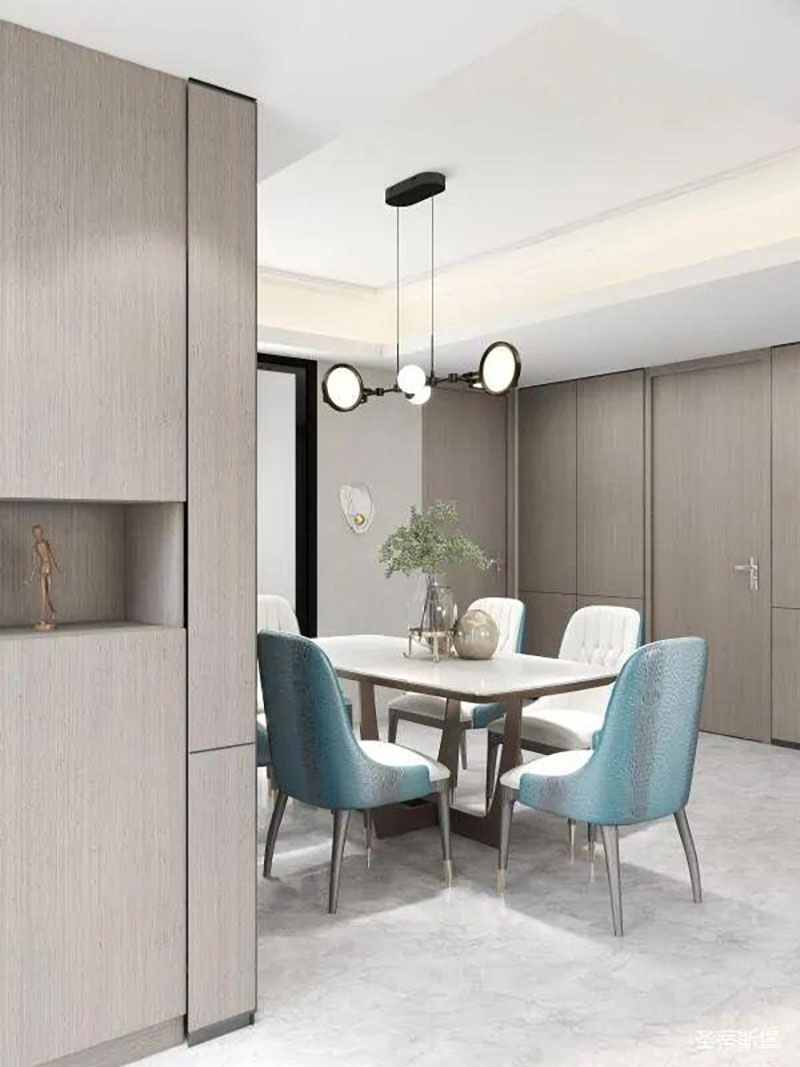 ▲澄亮湖藍的餐桌椅,一定是空間的點睛之處,溫柔跳脫的色彩,賦予了生活多姿多彩的體驗。經(jīng)典黑的簡約燈飾,在不忘溫馨氛圍的同時,也引領(lǐng)著造型界的時尚潮流。