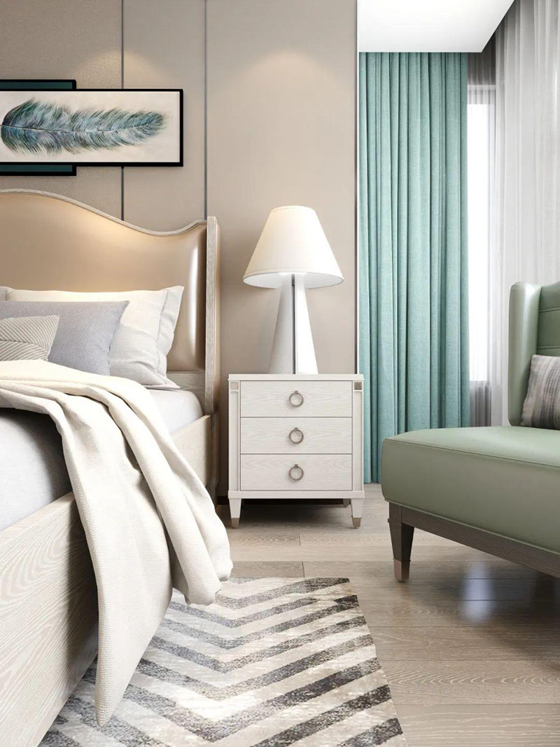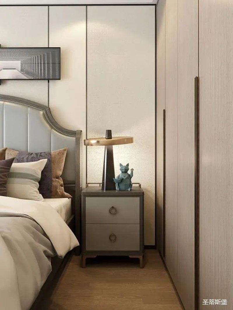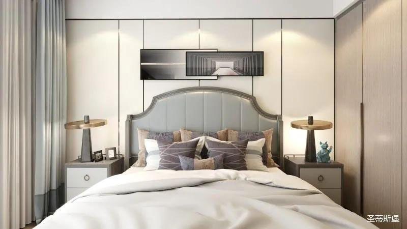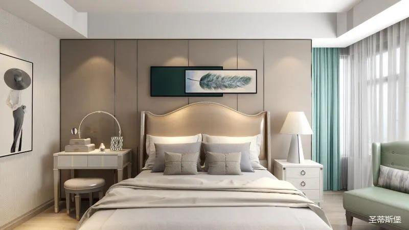 ▲次臥空間主要是以淺色為底調(diào),大面積的莫蘭迪色與淺色相平衡。極強線性裝飾畫帶來的延伸感讓視覺煥然一新。少許的金屬元素攝入,瞬間提升了空間的精致度,將溫潤雅致與時尚輕奢糅合在同一空間里,每一處都洋溢著浪漫的氣息。