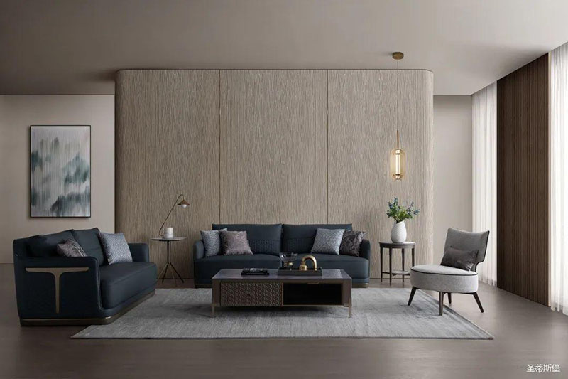 疏朗大氣的客廳空間,整體采用低明度的木紋色,在保留實木質感同時,也為空間增添了一縷木香。沙發(fā)線條利落干凈,深邃而浪漫的配色仿佛將居者帶進了海洋世界。藝術編制皮料搭配金屬底座,時尚大氣質感撲面而來,將理性和感性完美結合,提高了居家的時尚格調。