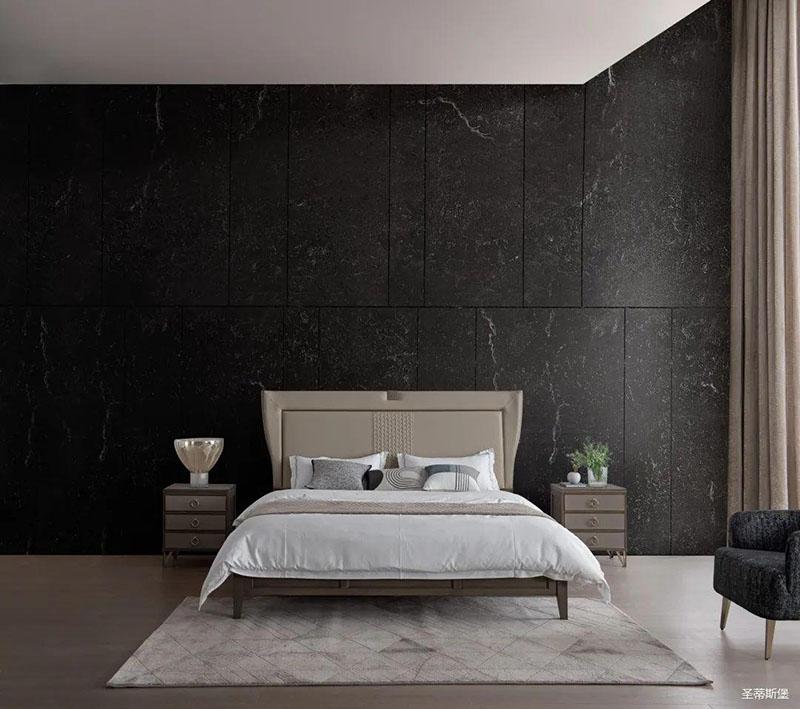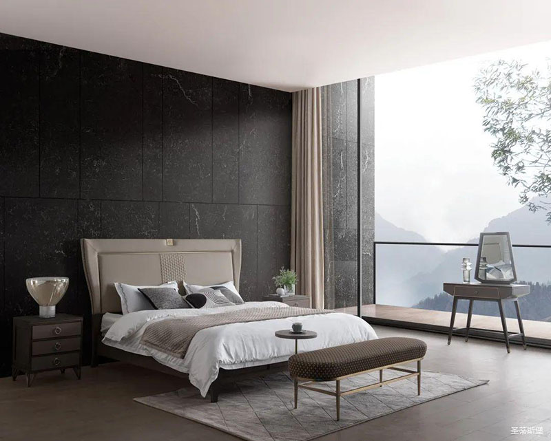 次臥床頭背景沿用了暗色大理石護墻,空間層次分明,簡約時尚的米色床屏糅合金屬鑲嵌與真皮編織藝術,看似舒適隨意,卻在極簡中透著淡淡的奢華感。大面積的落地窗讓自然光傾入室內,拉上與床屏同色系的窗簾,令次臥的室內空間明暗有度。