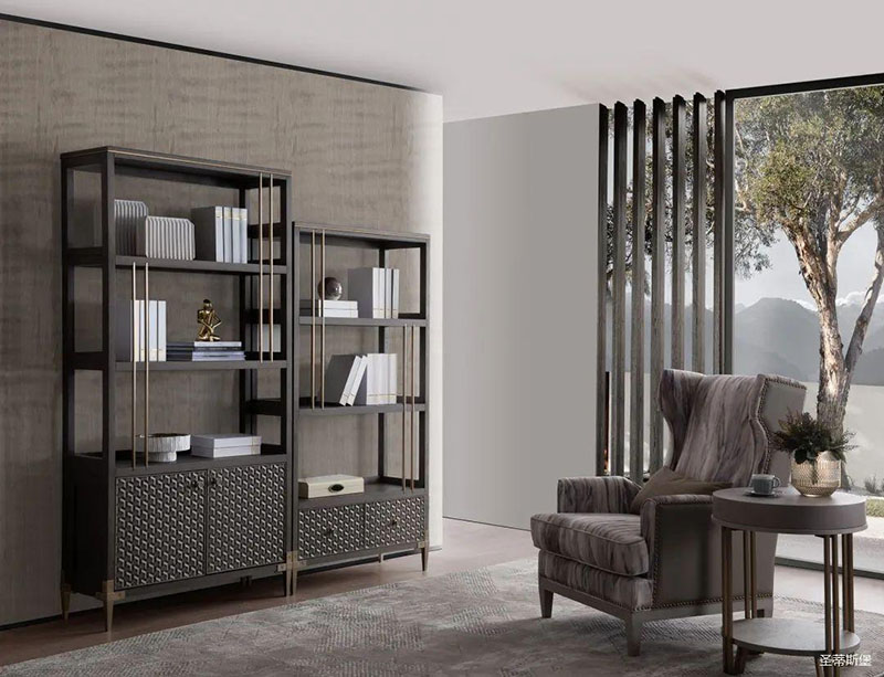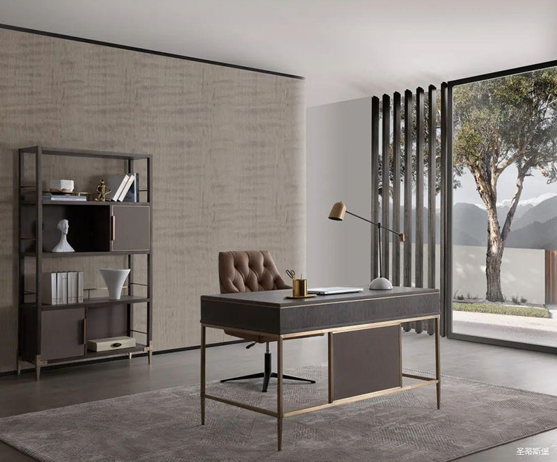 沉靜雅致的書房空間,溫潤實木與硬朗金屬線條相互配合,運用基礎幾何,打造空間的高級感。輕奢質感緩緩流淌,書籍整齊,擺件精致,無一不追求著精致細節(jié)與極致的品味,營造出時尚與沉穩(wěn)并列的氛圍,詮釋著居者對是生活環(huán)境的內在追求。