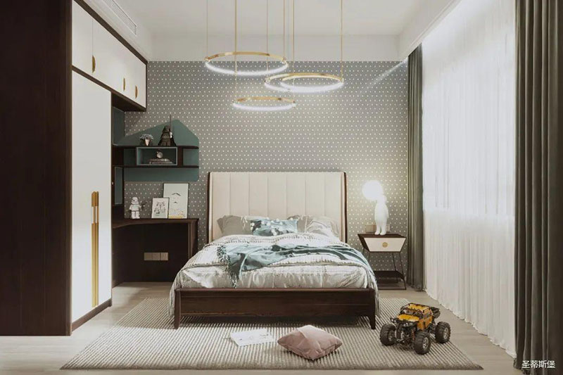 桌柜一體接壤設(shè)計(jì),絢麗與沉穩(wěn)相互襯托,足以達(dá)到空間最好的狀態(tài)。飽和又柔潤(rùn)的色塊,整齊坐落于床體柜身,通過(guò)極簡(jiǎn)規(guī)劃分配,刻畫(huà)出完美的實(shí)木紋理。造型獨(dú)特的床前燈,像一抹陽(yáng)光照進(jìn)心扉,散發(fā)著童真與夢(mèng)幻的味道,形成了獨(dú)有的輕奢精致感。