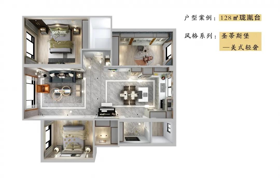 客廳延續(xù)著美式輕奢的氣韻,背景墻被簡約有序的金屬線條分割,營造出質(zhì)感空間的細(xì)膩。沙發(fā)沉穩(wěn)又不失時尚,色彩混搭更是讓人耳目一新,展現(xiàn)著美式風(fēng)格天性自由不羈的浪漫個性。