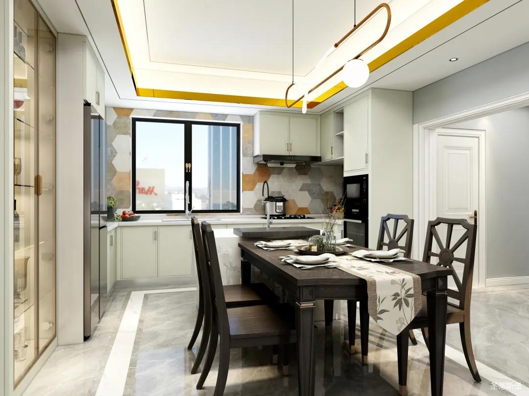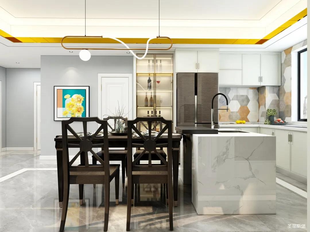 儀式感的餐廚空間,應(yīng)在自然光影中跳躍。從設(shè)計搭配細(xì)節(jié)將美式開放,不設(shè)限的特性顯現(xiàn),實木餐桌線條簡約且剛毅,中島臺鏈接起用餐空間的隨性,不遺余力的拉伸空間的層次感。
