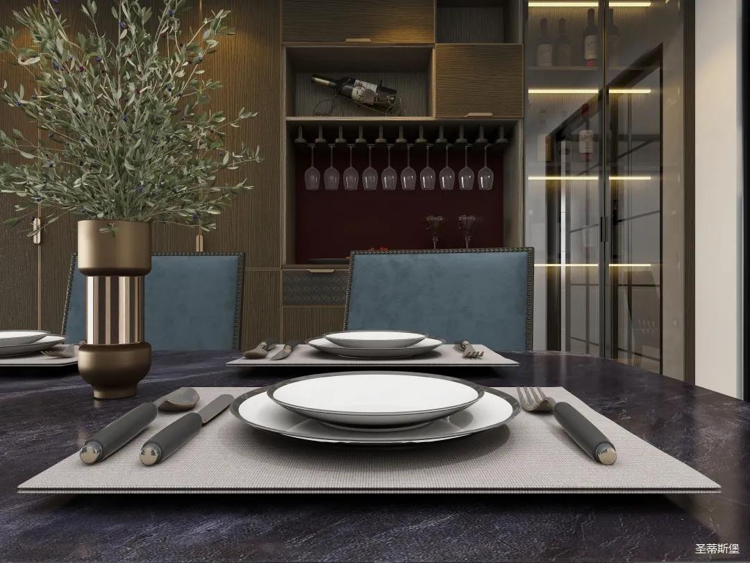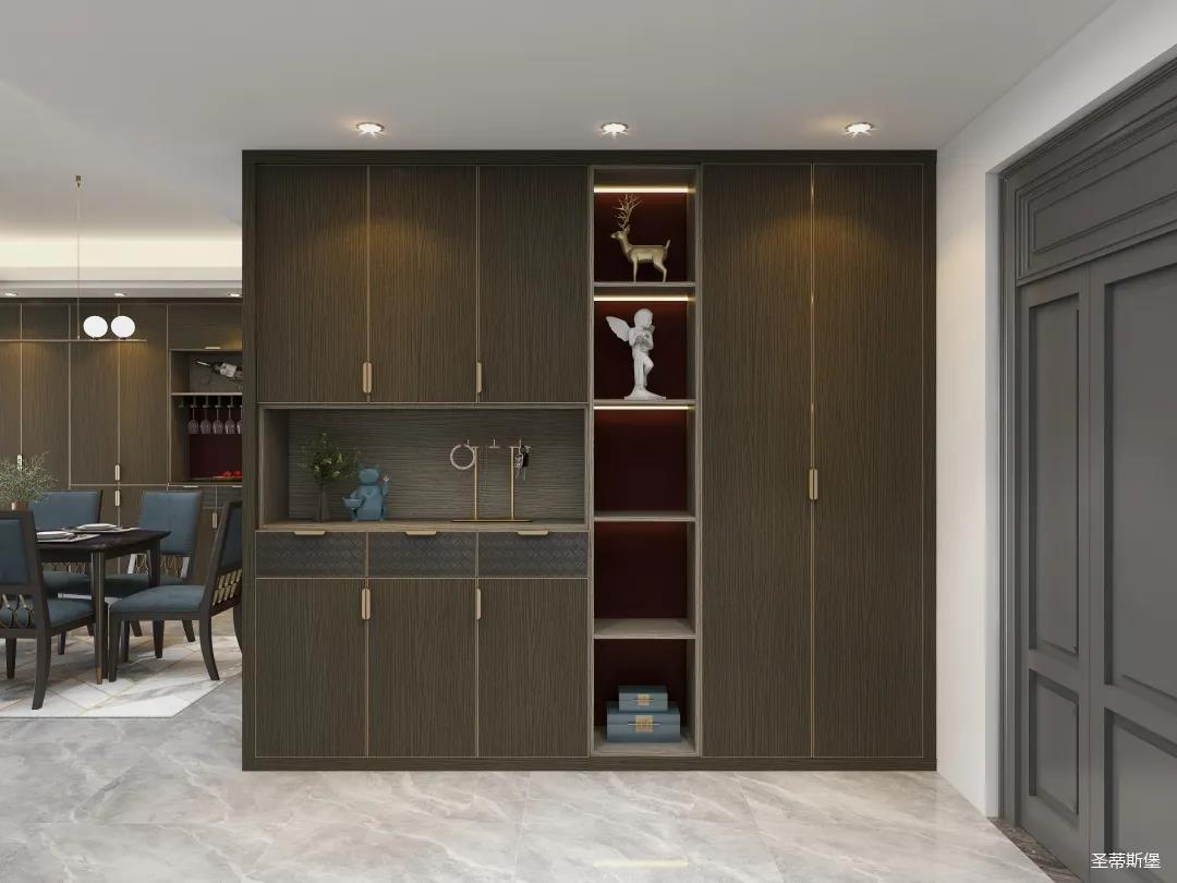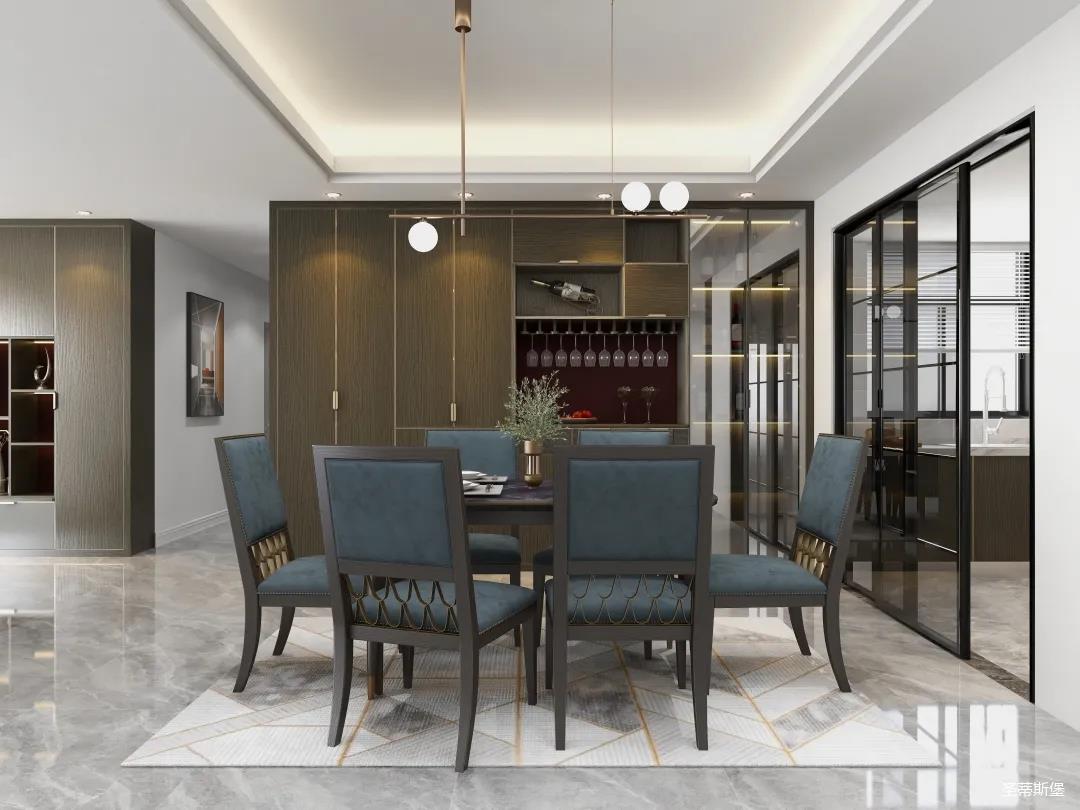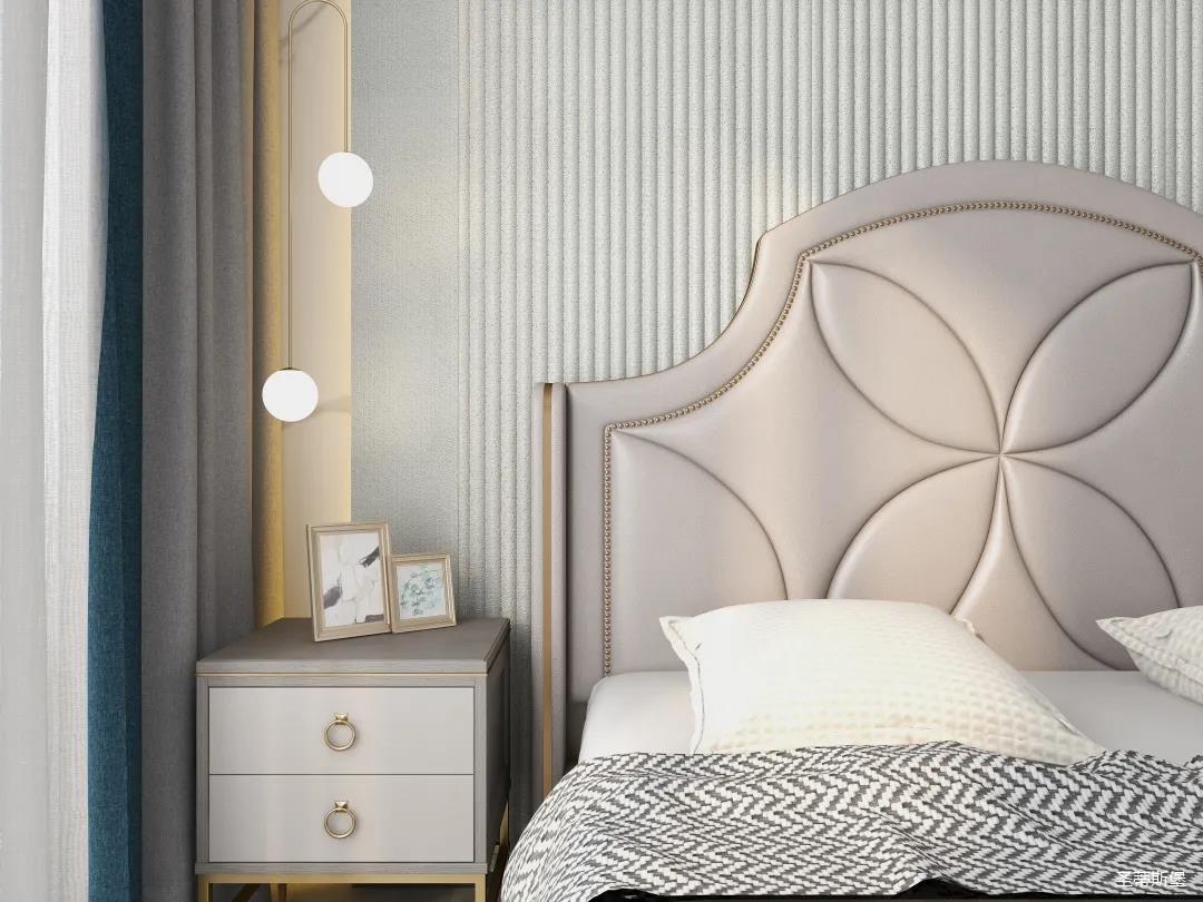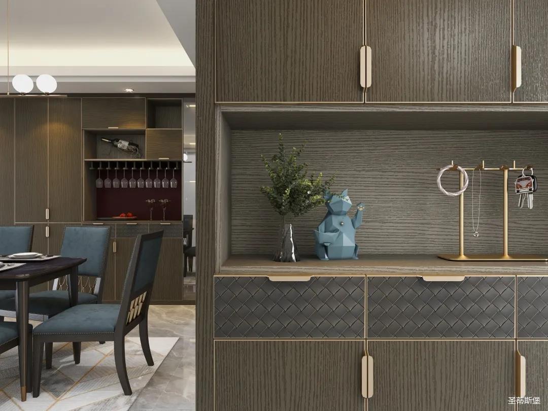 材質的交替與光影的變換,具有濃濃的現代簡奢色彩。獨一無二的英倫爵士灰定制柜,由延邊鑲嵌的香檳金拉絲金屬分割,線條流暢且奢華,不僅代表著時尚,也崇尚了實木韻味。設計師將現代、實用、精致的藝術設計風格應用其中,更是精致生活方式的藝術演繹。在平靜的空間中表現出獨特的藝術骨感,滿足我們對精致生活的精神追求。