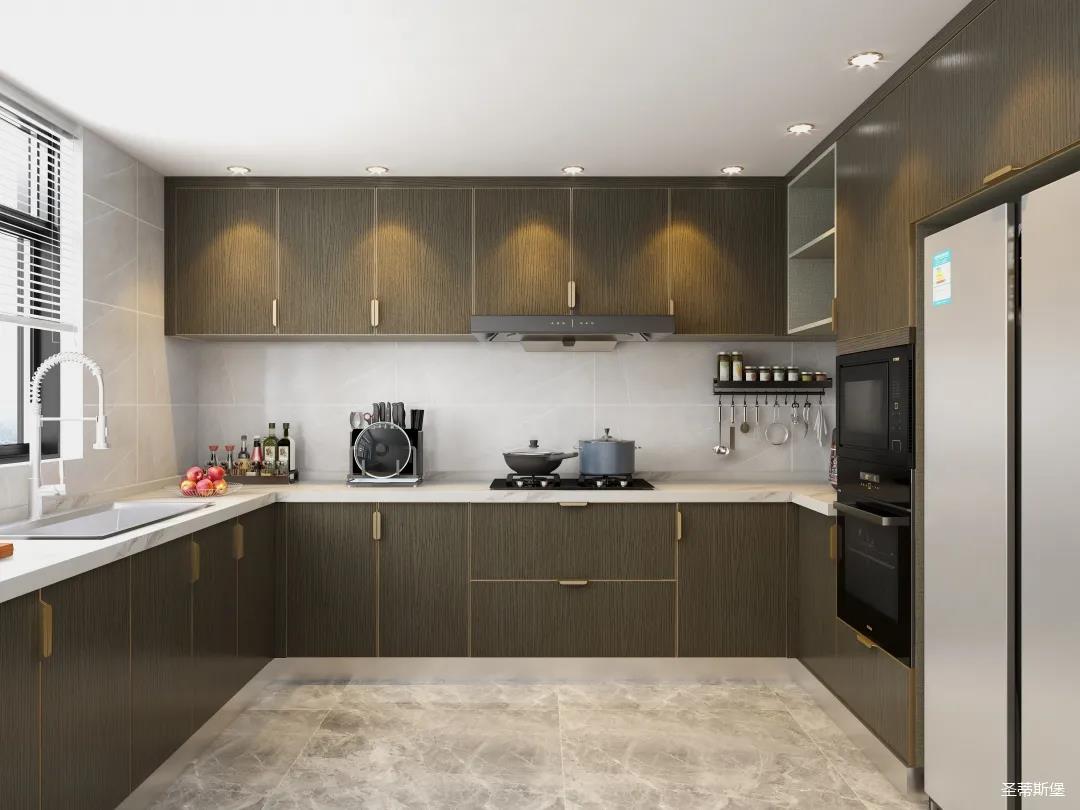 u型空間格局,設計師將功能區(qū)合理劃分,讓洗切煮一氣呵成。以米白水磨石+英倫爵士灰實木為主導的櫥柜系統(tǒng)中,人體工學流線,讓每一細節(jié)都折射出屋主對生活的考究,一廚一柜,每一處都關乎著我們對生活的熱忱。