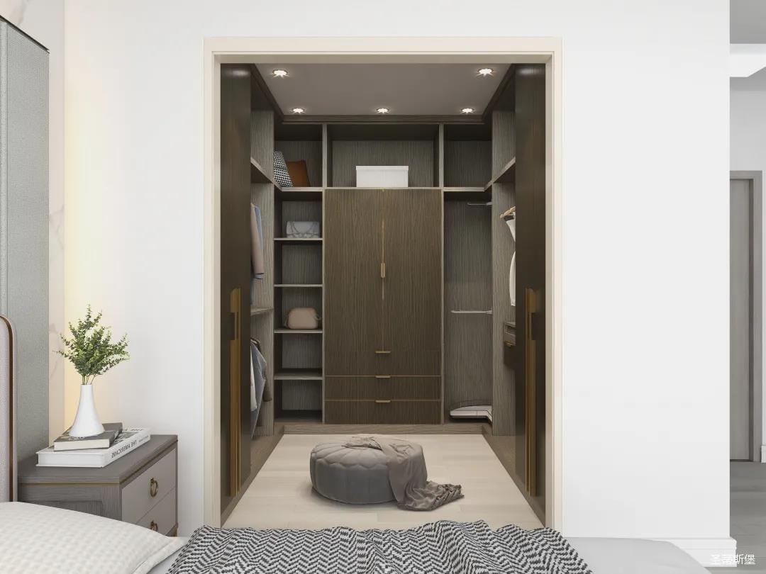 衣帽間進行u型設計,全落地定制形式,融匯了簡奢風格獨具的浪漫與優(yōu)雅。金屬、實木拼接細節(jié)與天然材質為衣帽間注入與眾不同的高級氣質!開放式的懶人布局,讓衣物收納一目了然,能同時滿足疊放與掛衣功能,實現了“一柜多用”。