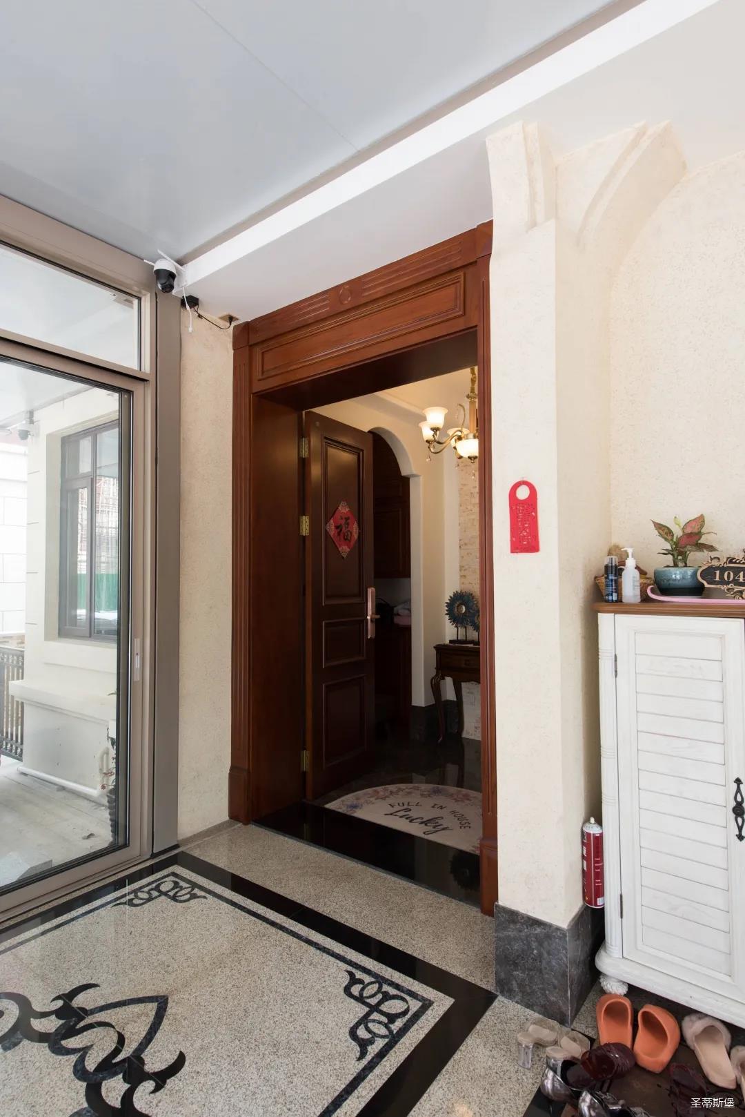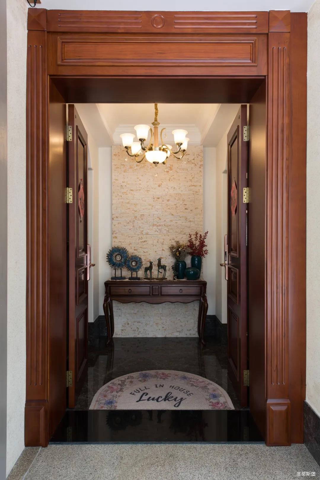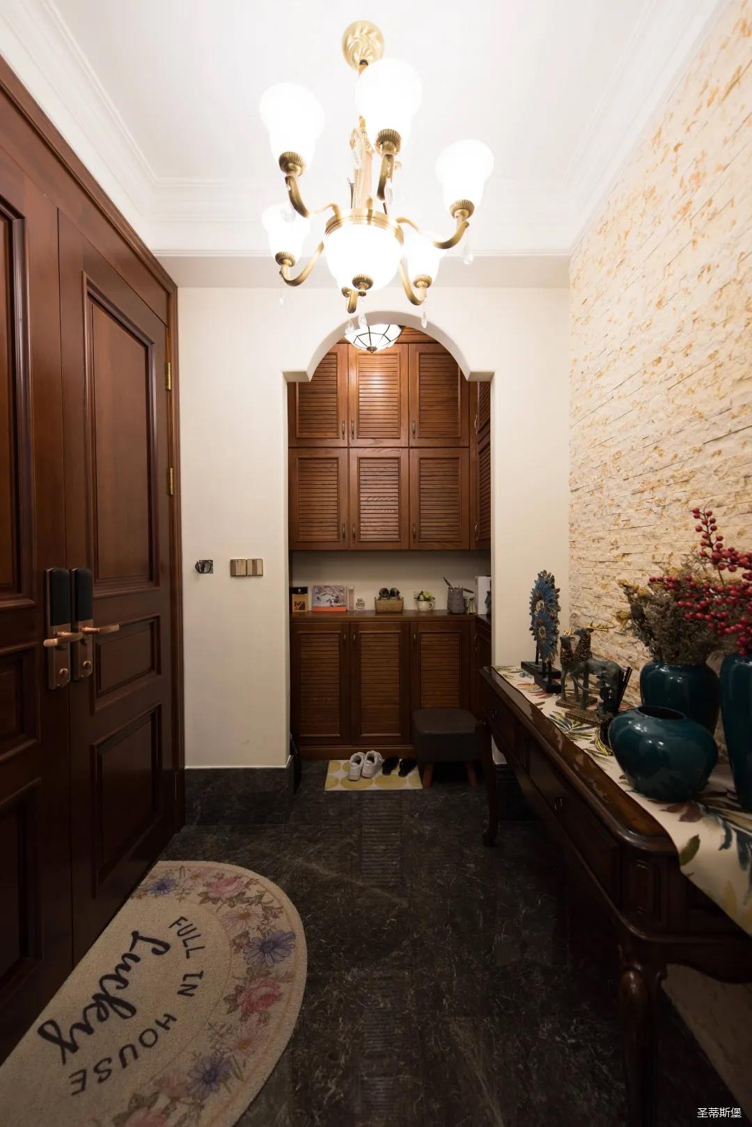 入戶玄關(guān)雙開(kāi)門(mén)設(shè)計(jì),儀式感滿滿!地面定制的瓷磚貼花設(shè)計(jì),典雅又大方。核桃實(shí)木玄關(guān)桌,加上精致的擺件,經(jīng)典美式復(fù)古吊燈,不著痕跡的展現(xiàn)出居者對(duì)生活的激情,魅力吸睛,從入戶開(kāi)始感受古典氛圍。
