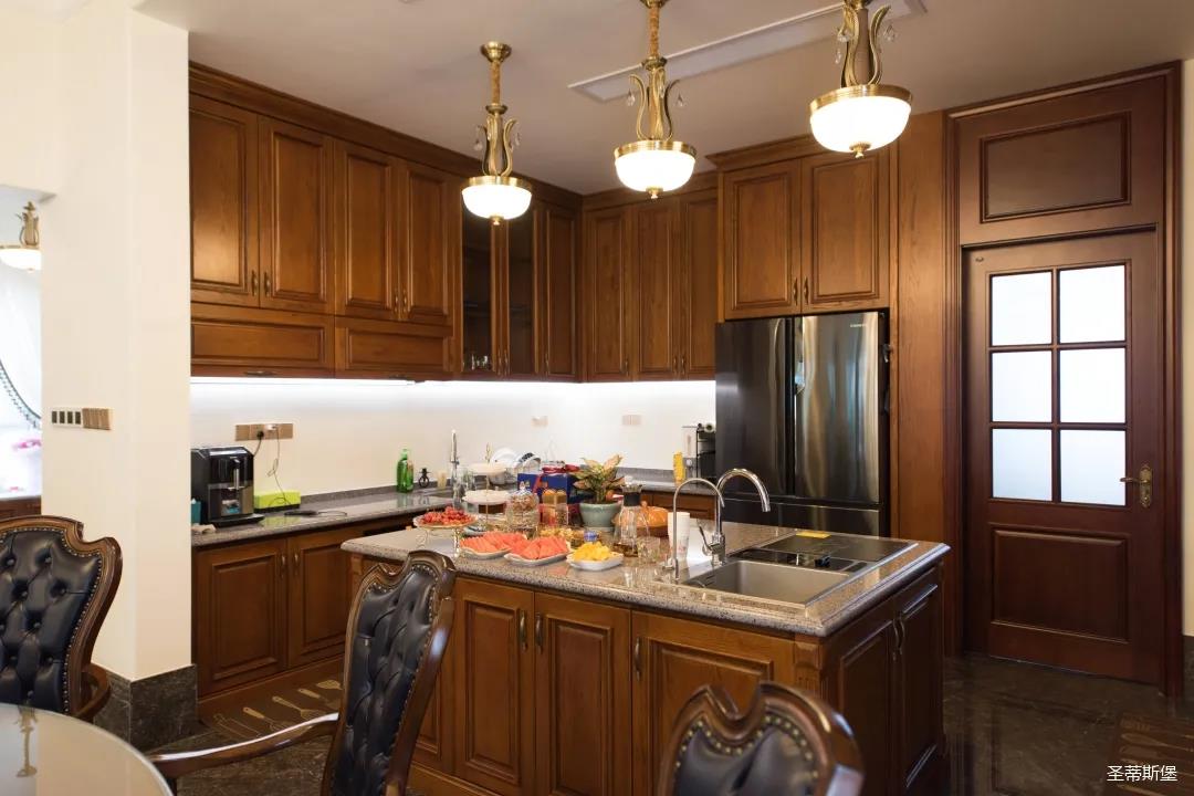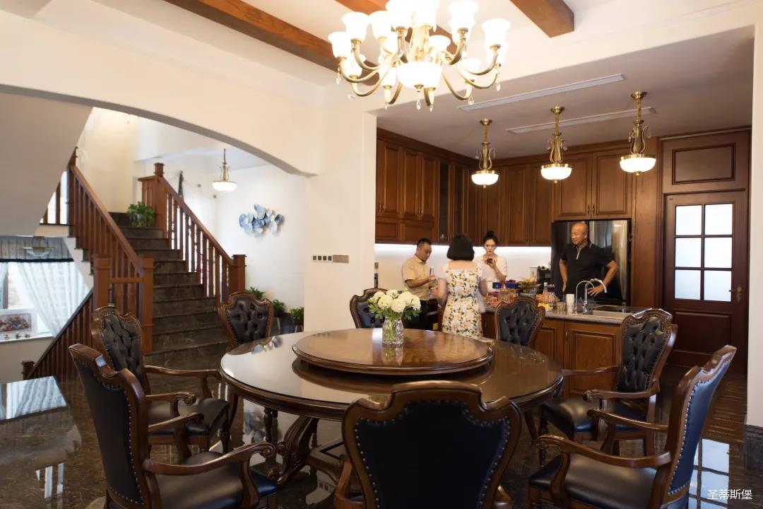 玄關(guān)進(jìn)入轉(zhuǎn)角處,以穩(wěn)重大氣實(shí)木為主色調(diào)的開(kāi)放式中西餐廚空間,將一體化無(wú)隔斷設(shè)計(jì)貫徹到每個(gè)細(xì)節(jié),采用了親膚真皮質(zhì)感的餐椅,手工雕刻的曲線讓原本硬朗的空間變得格外優(yōu)雅,自上而下,構(gòu)成完整的美式空間氣度,在每天的生活點(diǎn)滴間,沉浸在美式風(fēng)情中,更加隨性舒適。