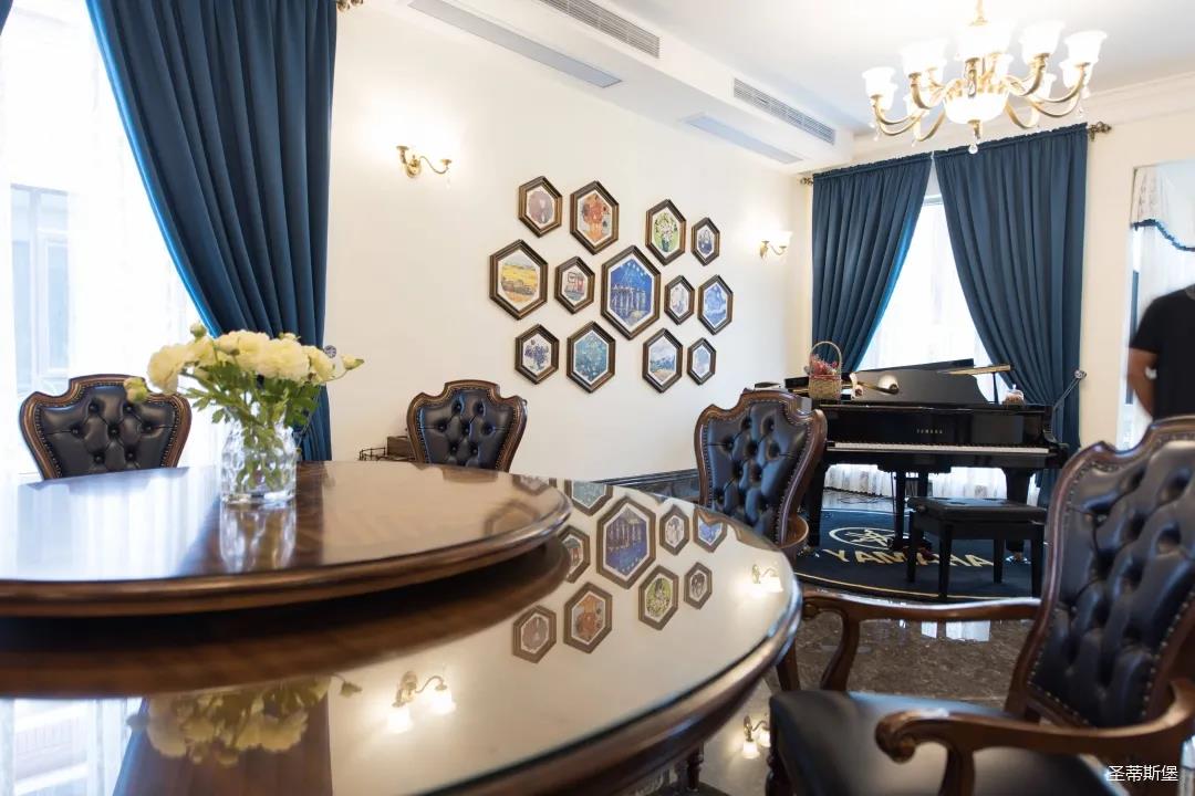 業(yè)主喜歡沉穩(wěn)的美式新古典風(fēng)格,整體統(tǒng)一的色調(diào),呈現(xiàn)了一種莊重的典雅感。醇厚的實(shí)木真皮沙發(fā),以古典的手法描繪出一種略帶復(fù)古的時(shí)尚奢華。一抹深藍(lán)迂回婉轉(zhuǎn)映照著空間的色系,明暗相對(duì),符合著現(xiàn)代審美,卻又不顯沉悶。轉(zhuǎn)角處的一臺(tái)復(fù)古唱片機(jī),還原了對(duì)音樂(lè)傾心的浪漫,抬起撥桿將唱針落下,隨著唱片的轉(zhuǎn)動(dòng)和音樂(lè)的響起,美好的一天就此開(kāi)始。