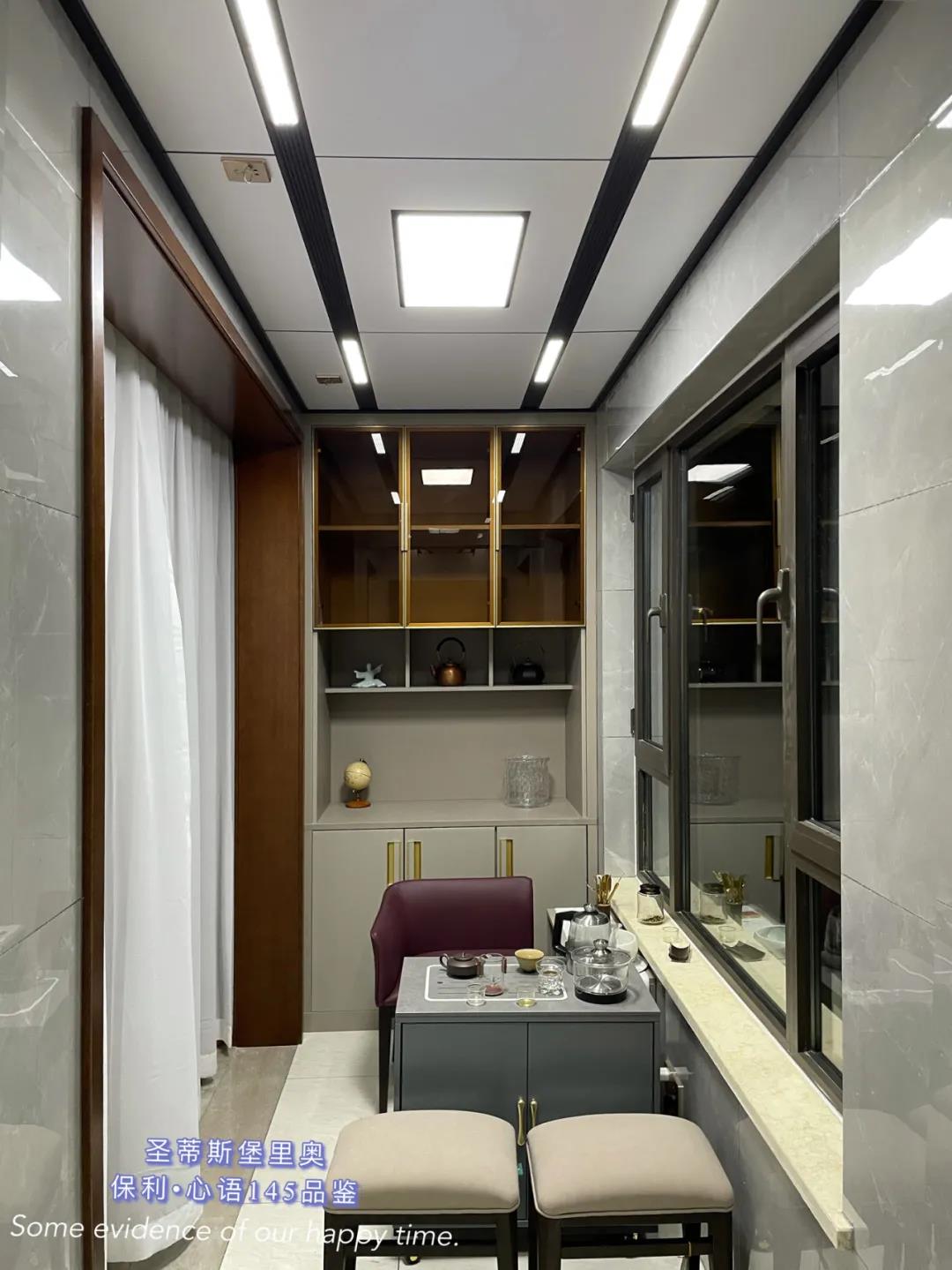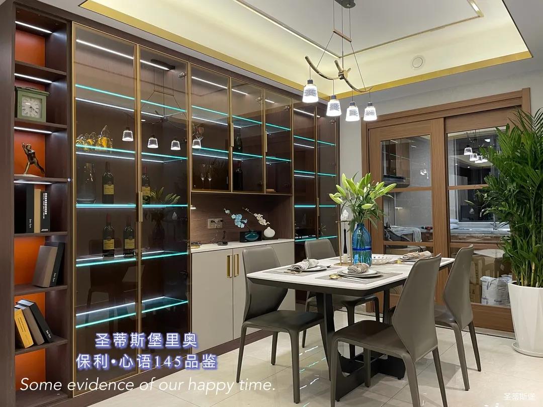 ▲餐廳一面及頂?shù)耐该鞴耋w,以簡(jiǎn)練的金屬線條分割出收納空間,讓立面視覺(jué)更顯精致干凈。餐邊柜設(shè)置了臺(tái)面、全玻璃展示區(qū)以及隱藏收納區(qū),滿足了日常生活中多樣的收納需求。