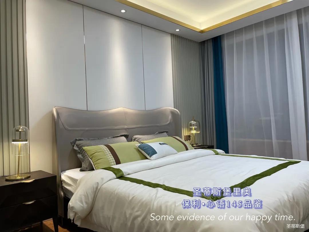 ▲次臥選用拼色,傳達(dá)出一種空間平衡美。這里的色彩相比于主臥更加平緩,視覺(jué)上也多了份輕巧。床屏與背景飾面組合出疏密有序的線條比例,詮釋著一個(gè)精工而不流于艷俗,純凈而不至于過(guò)渡簡(jiǎn)約的精致臥房。