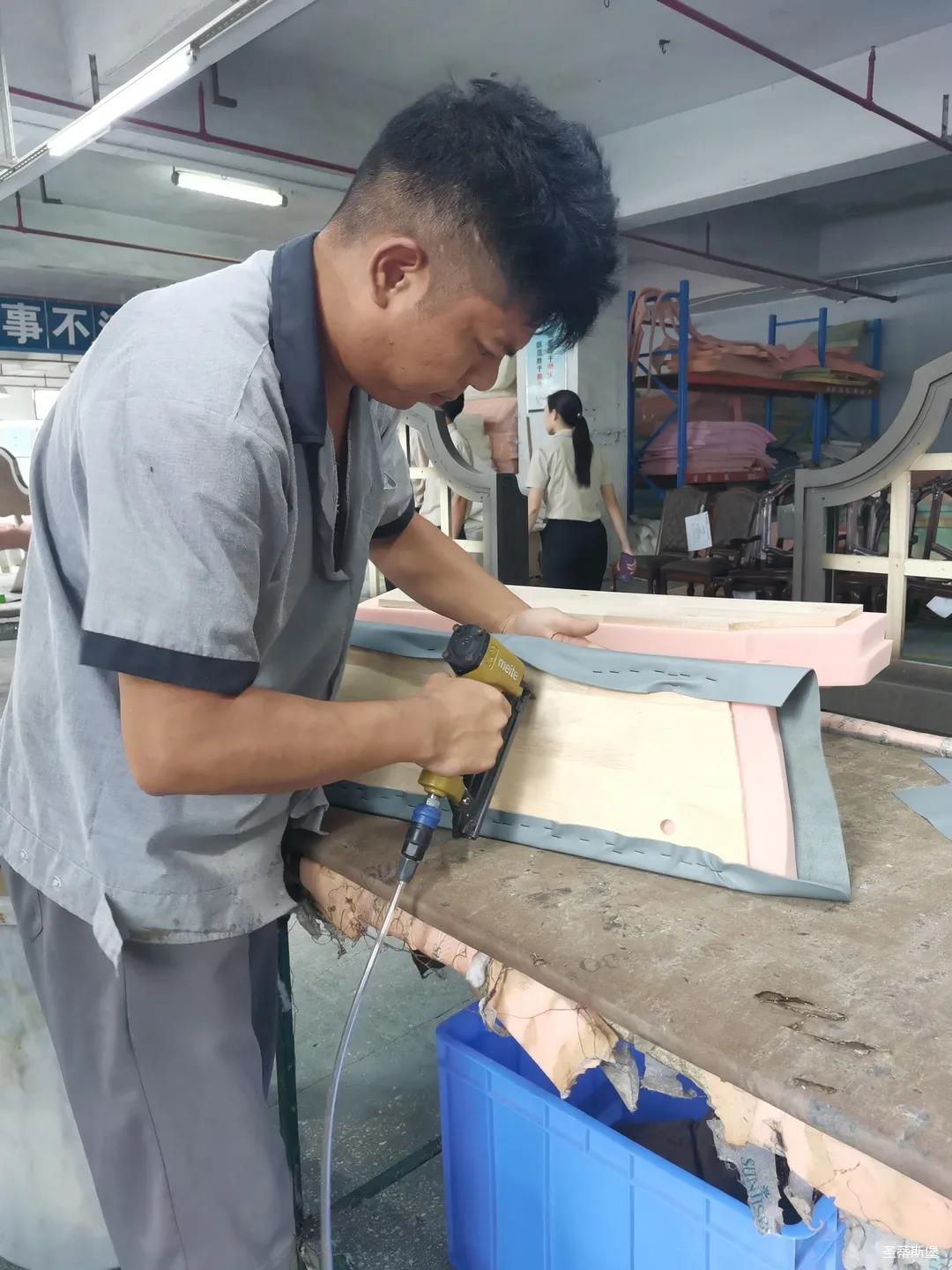 本屆技能競賽設(shè)置為工業(yè)組和商業(yè)組,共設(shè)競賽項目8項,其中,工業(yè)組競賽包含了打滾邊、打銅釘、自身產(chǎn)品組裝、成品組裝、柜體噴底色、修色、板材開料等七大細項。商業(yè)組以組裝辦公臺、床頭柜為主。
