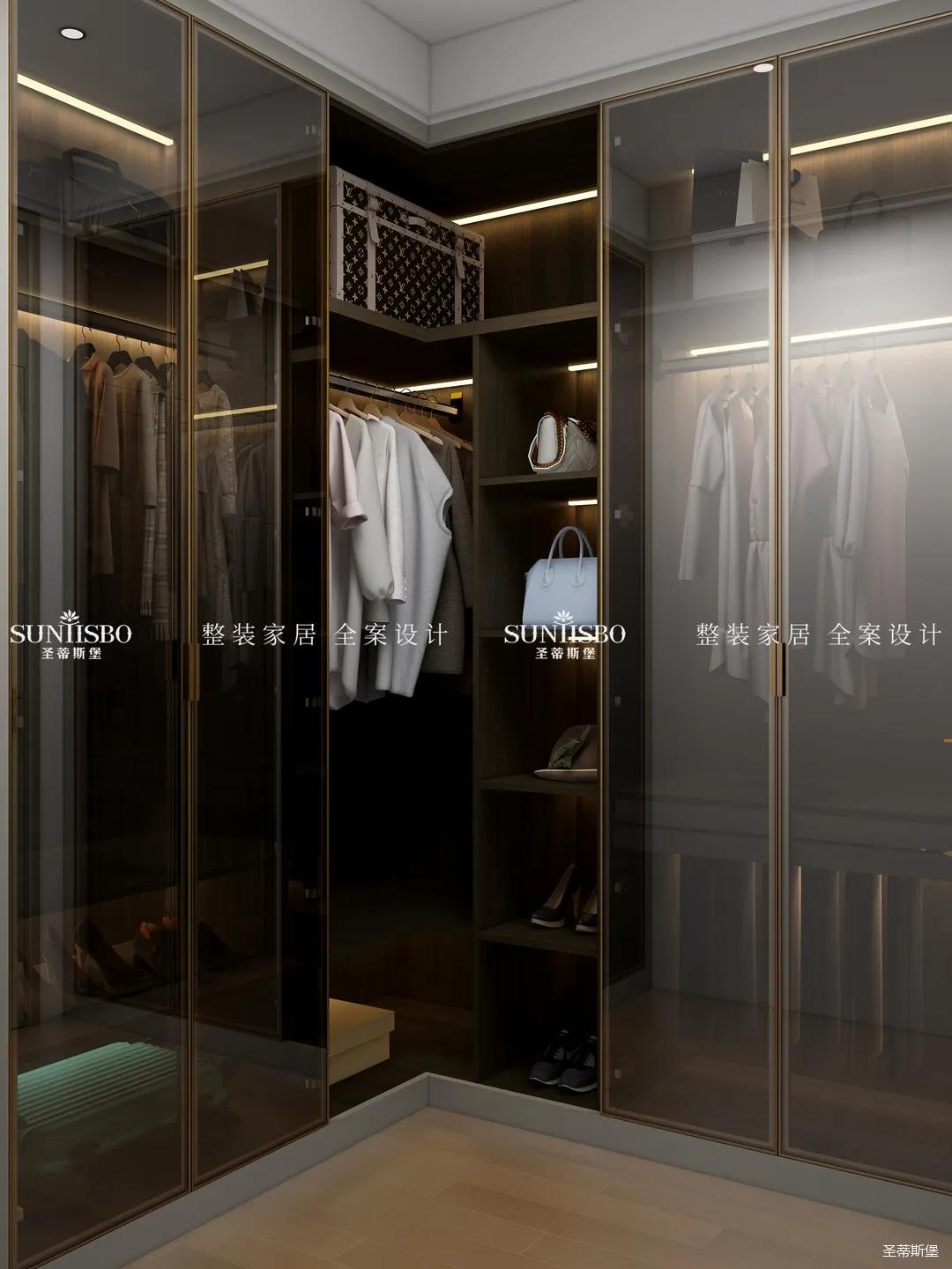 L型衣帽間采用了玻璃與實木組合,用時尚的煙熏色打造純凈質(zhì)感,避免了全實木柜門的無趣。人性化的分區(qū)包含了鞋架、褲架、首飾收納等,將衣帽間的實用性靈活設計成業(yè)主的收納習慣。