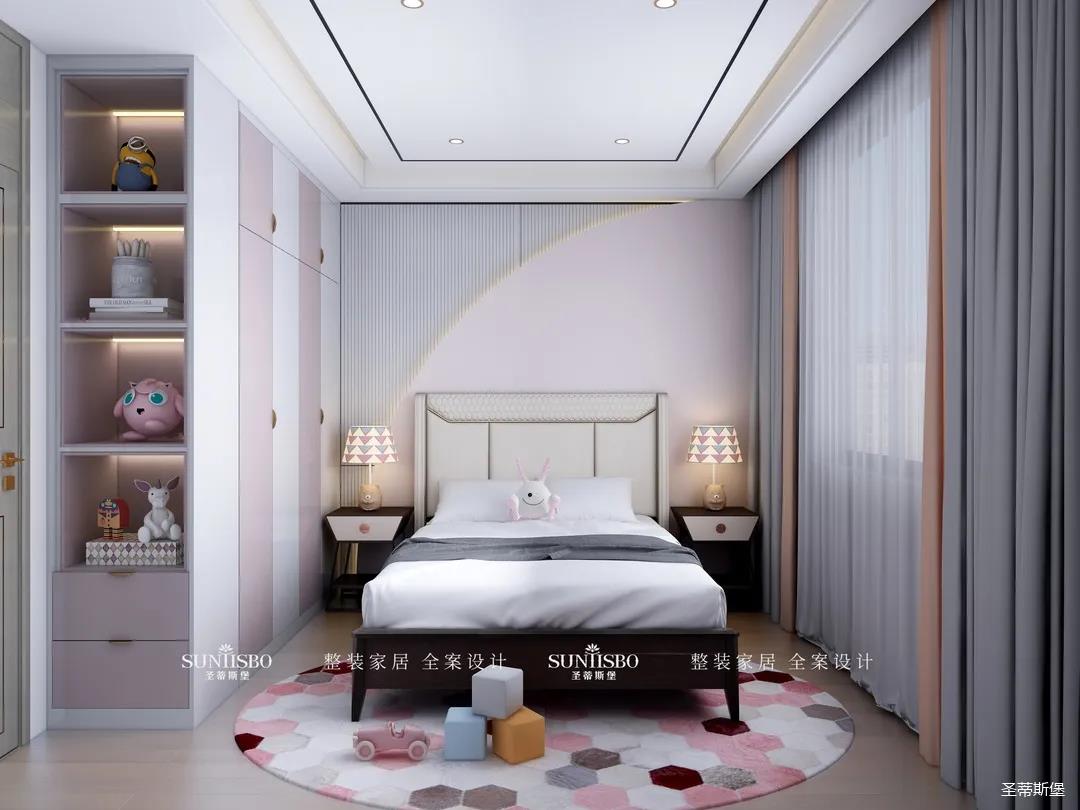 兒童房相對于其他空間更立體自然,幾何紋理的床屏和床頭柜延續(xù)了空間獨特的設計元素,菱格形的地毯,色彩交錯排列,滿足了兒童房應有的童真與想象力。粉白相間的定制收納,搭配同色系充滿童趣的動物公仔擺件,儼然成為了兒童的夢幻小天地。