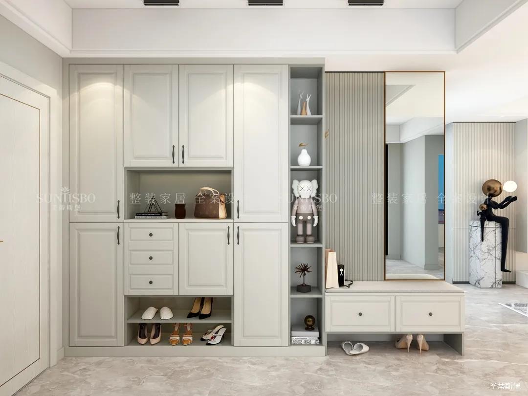 入戶側(cè)面設計一字型玄關,腰部,底部留空做層板,便于隨手放置鑰匙、鞋包等物品,中間留空設計為開放展示區(qū),加上軟裝飾品點綴,達到業(yè)主對品質(zhì)生活追求的理想狀態(tài)。應女主人要求,玄關還加長延伸出妝鏡和換鞋凳,讓動線自然流暢。