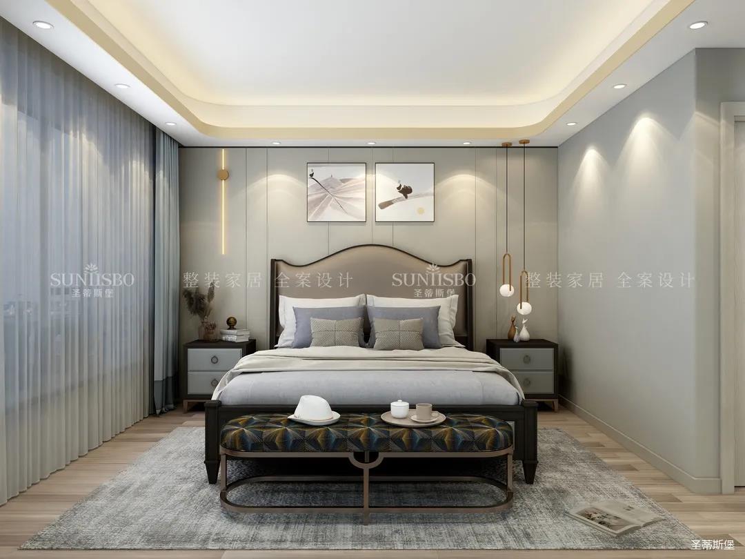 主臥整體暖色色系為空間注入了專屬調(diào)性,高明度的家具色彩與整體空間區(qū)分,透過材質(zhì)肌理與光線相互交疊,傳達著空間里安定溫暖的情緒。立體輕奢的床尾凳,提示著空間主人對時尚的高質(zhì)量生活追求。
