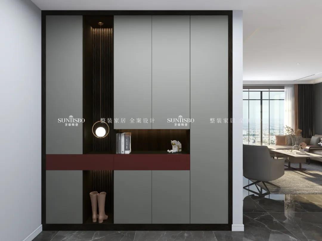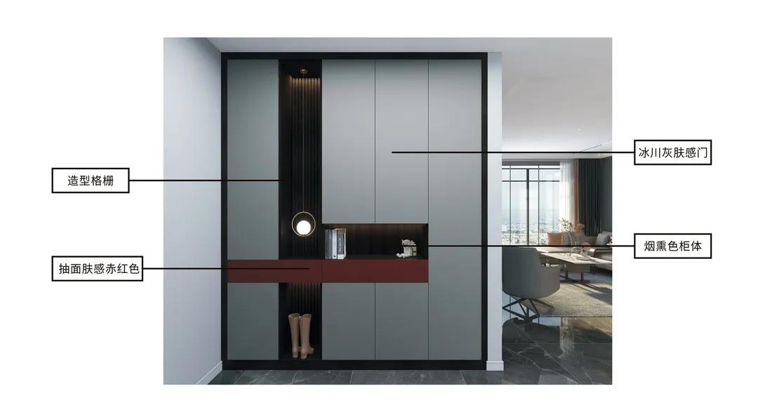灰色平板門(mén)和煙熏色柜體做深淺搭配,搭配深灰鋁框門(mén),整體簡(jiǎn)單又大氣,再點(diǎn)綴一抹赤紅色,點(diǎn)亮了整個(gè)空間。