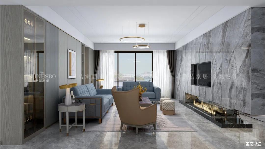 精細結構下沙發(fā)角幾的微金屬結構,干凈利落,彰顯質(zhì)感。整面大理石背景墻將電視設計為壁龕結構,底部的裝飾壁爐讓家的溫馨感再度升級。