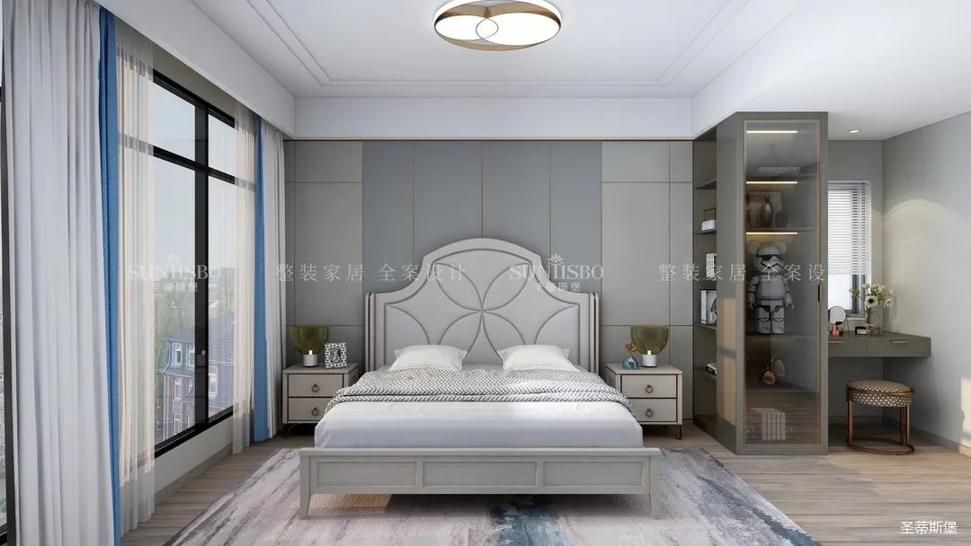 主臥的設計,整體風格與色調(diào)的一致,通過空間設計與軟裝細節(jié)的調(diào)控,顯得主臥多了一份寧靜與放松。四照花床屏的細節(jié)、材質(zhì)色彩的把握、隔斷小書桌的設計,無不體現(xiàn)著設計師獨特的品位和全案設計的能力。