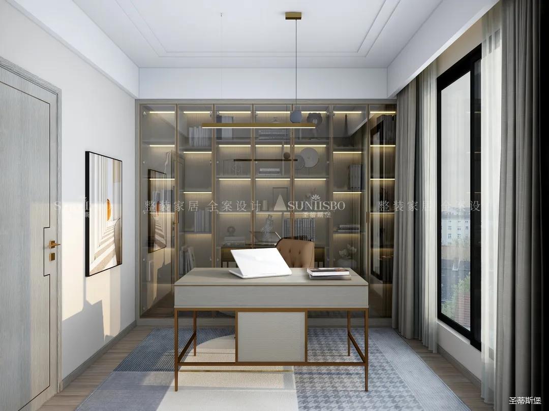 書房在陽光下襯得通透自然,半透明的灰玻利用高級且親和的色彩貫穿著柜體與空間的互動,溫潤的木質(zhì)、輕奢的金屬以拼合的狀態(tài),將屋主感性與時尚的生活理念滲透進書房空間。不同材質(zhì)的搭配為空間增添平衡感,使得緊繃的工作狀態(tài)得到放松。