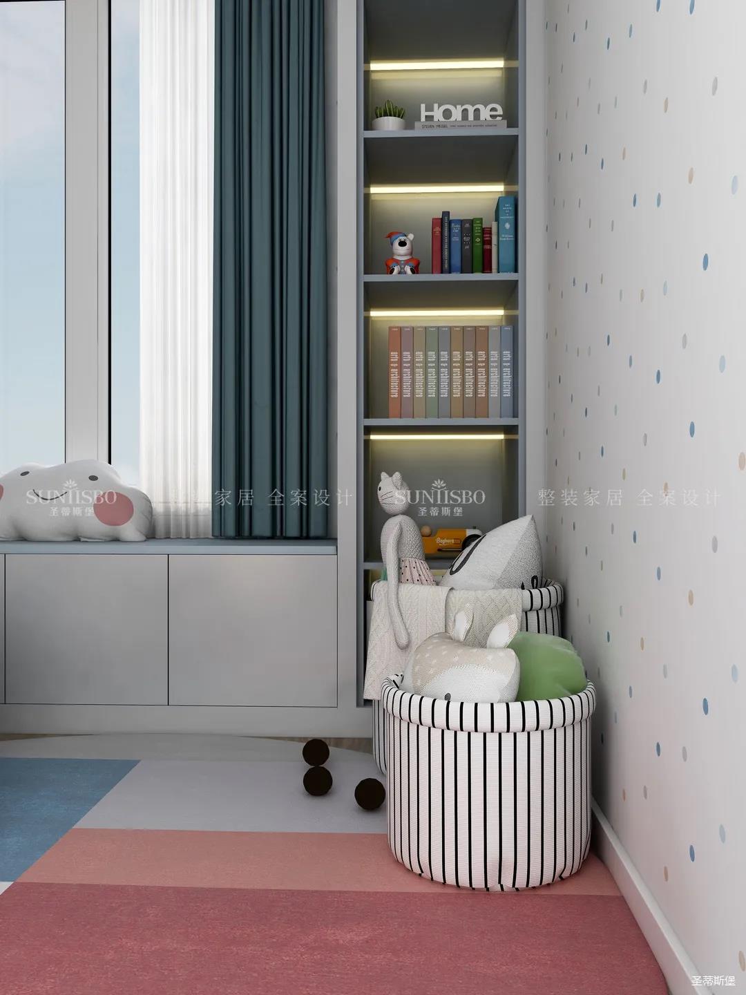 兒童房追求的是童真與自然,柜體的色彩與軟裝搭配完美呼應,云朵山峰的背景墻,以特立獨行的設計在視覺上讓心靈得到放空的意境。沿窗打造的飄窗格局,增加空間的功能性,造型簡約的柜體根據(jù)家裝理念摒棄了繁復的設計,更多展現(xiàn)的是空間自然之美。