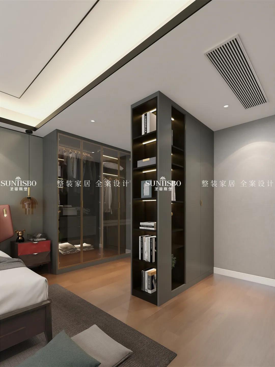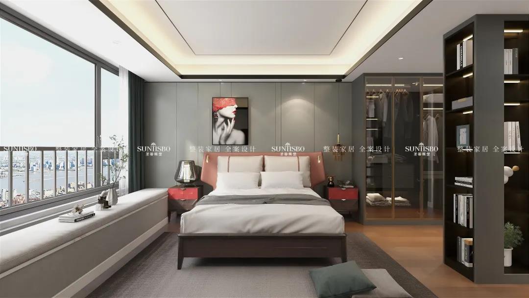 主臥的床是意式輕奢時尚與東方雅韻極致融合,沒有半點突兀和乖張。,意大利最出名的便是它的工藝與設計,時尚的莫蘭迪色系、輕奢金屬的運用,體現(xiàn)嫻熟的意式家具設計底蘊,兩者之間融合的相得益彰。