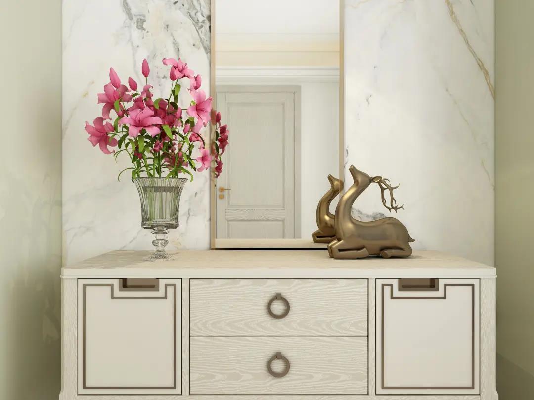 正前方是藝術(shù)大理石搭配仿古白移動(dòng)玄關(guān)柜,