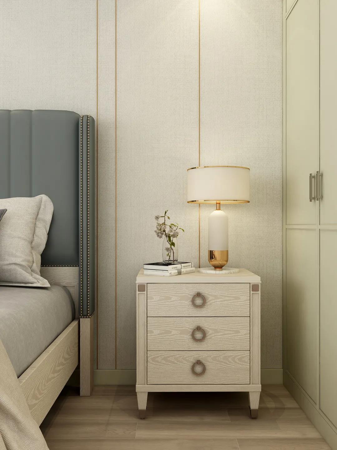次臥背景墻兩端是對(duì)稱式設(shè)計(jì),以淡雅的暖色為主,